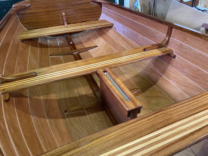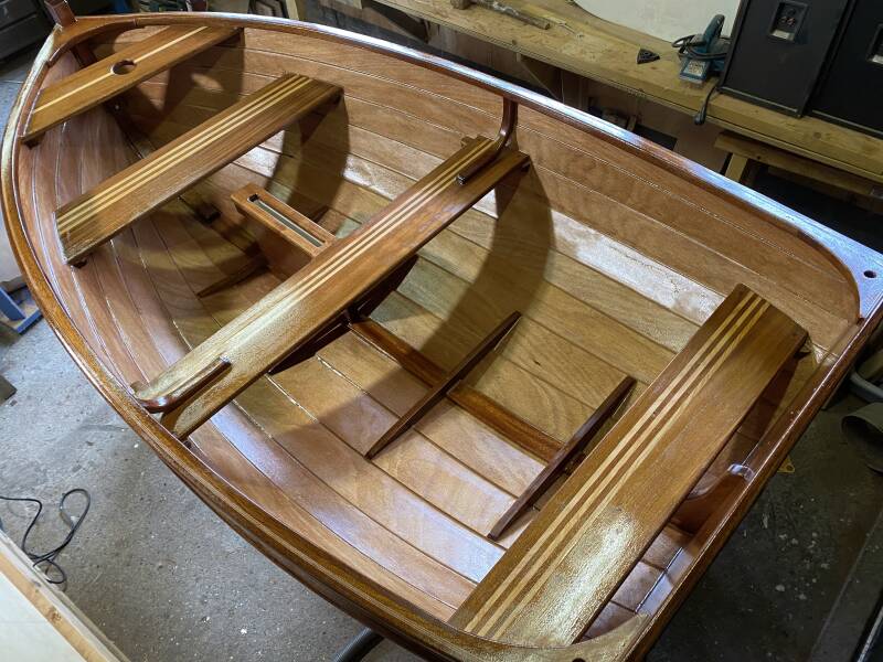 Finally applied the first layer of epoxy to the inside of the Auklet. I have set the boat upright so that I can reach everything better and in the hope that less dust will fall on it.