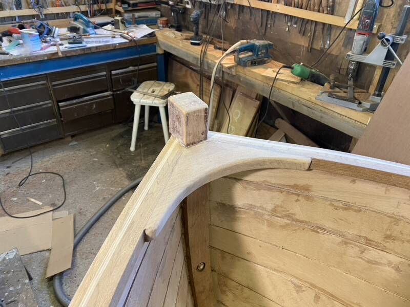 The floor trusses are in. I also added a transom knee. This one is not on the drawing but I think a boat with such a classic look should have one. Here I have weighted the trusses with sandbags to get a good bonding.